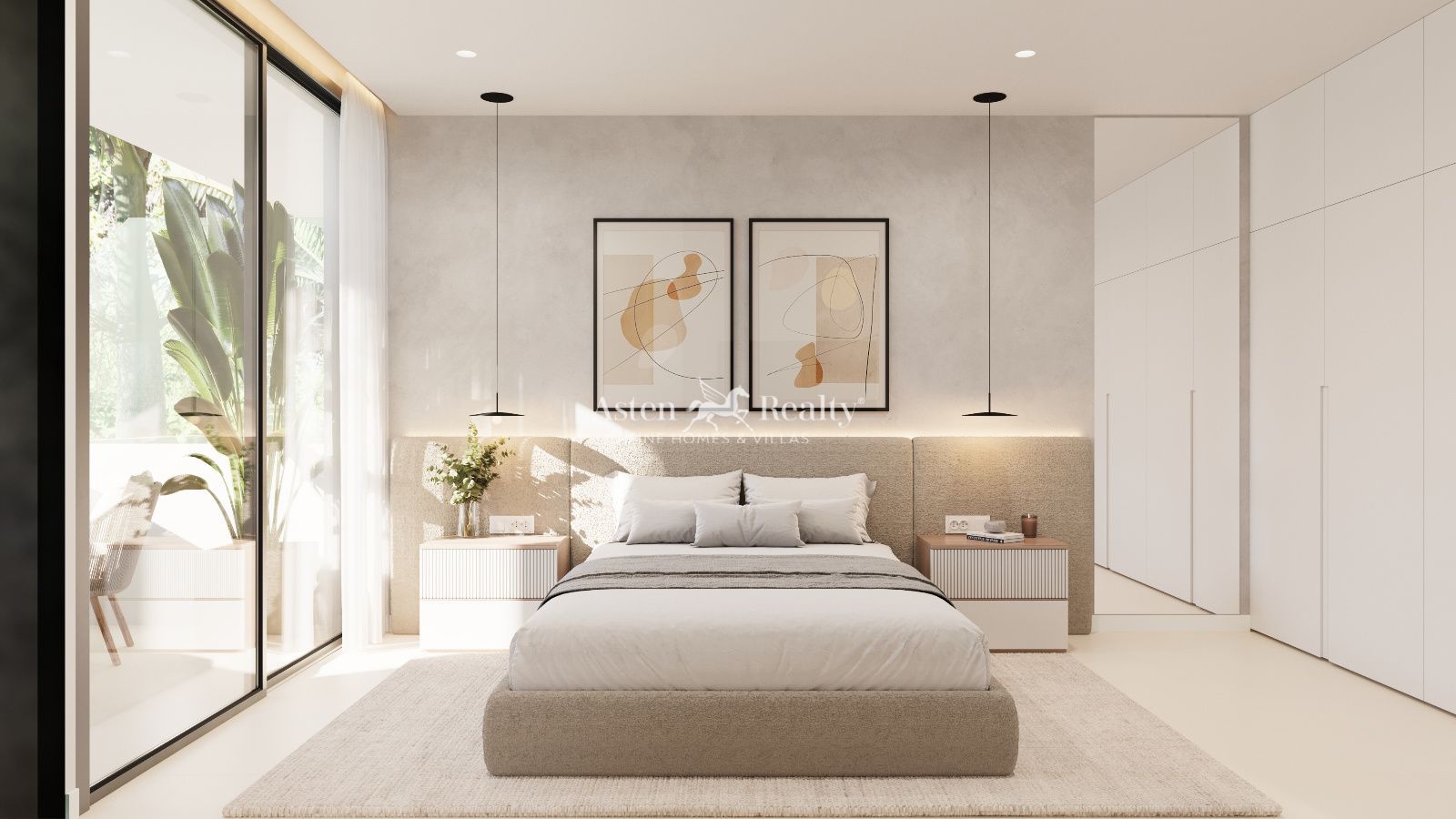 The warm and bright master bedroom offers privacy and comfort, evoking a luxurious spa atmosphere.